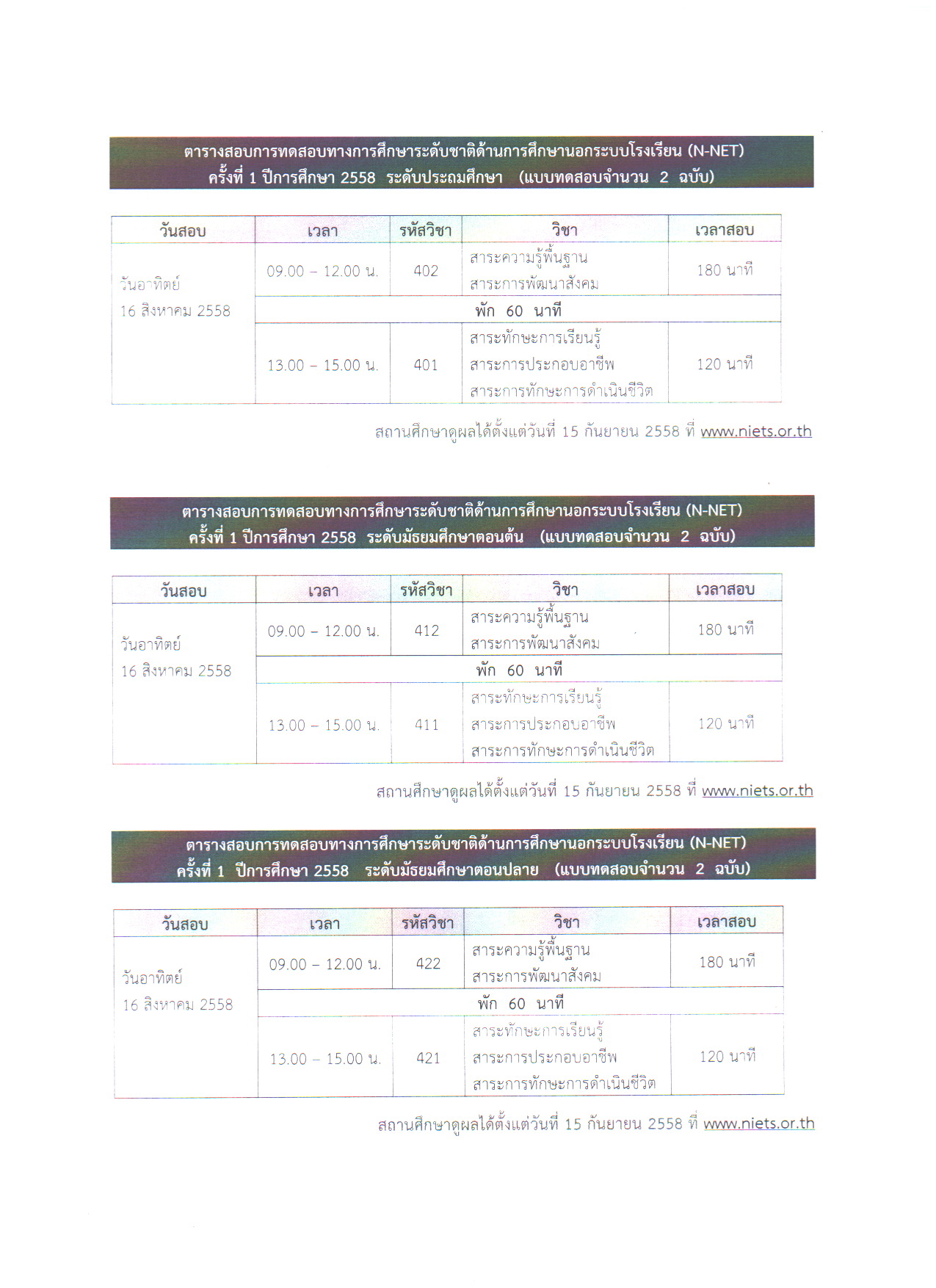 | ตารางสอบ N - NET ครั้งที่ 1/2558 |